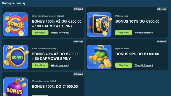 Dla regularnej gry prowadzimy stałe cotygodniowe bonusy reload, które pojawiają się w określone dni. Wednesday Reload Bonus (EUR) to 40% do €200 plus 50 darmowych spinów. Friday Match (EUR) daje 101% do €300, co przydaje się, gdy chcesz szybko doładować saldo. Na większe weekendy Weekend Reload Bonus (EUR) oferuje 100% do €1,000.