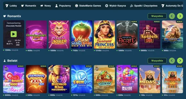 Typy gier obejmują automaty, gry stołowe, kasyno na żywo, gry crash, wideopokera, zdrapki, jackpoty, bingo oraz keno. Jeśli interesują Cię głównie automaty StakeMania, użyj filtra dostawców, aby przeglądać Pragmatic Play, Play’n GO, NetEnt lub nowsze studia, takie jak Nolimit City i Hacksaw Gaming. Jeśli wolisz szybkie przeglądanie według kategorii, strony automatów kasyna StakeMania zawierają też wyszukiwarkę i sortowanie, co pomaga, gdy znasz już tytuł. Nie oferujemy zakładów sportowych, więc w menu nie ma rynków sportowych ani stron z kursami.